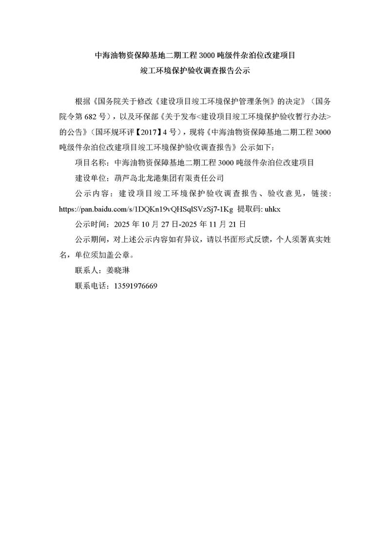 中海油物資保障基地二期工程3000噸級(jí)件雜泊位改建項(xiàng)目 竣工環(huán)境保護(hù)驗(yàn)收調(diào)查報(bào)告公示